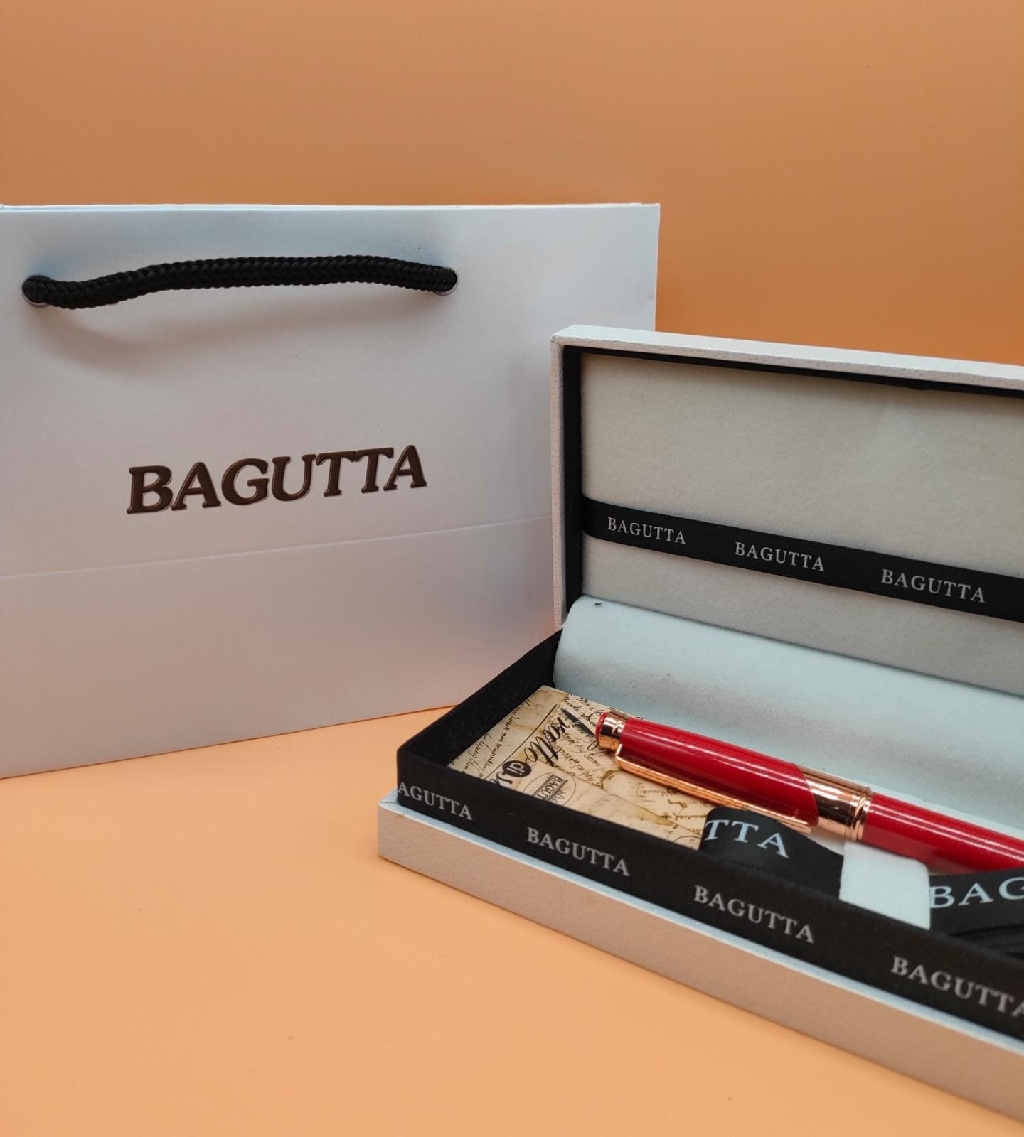 Elegante penna roller rossa con rifiniture di metallo color oro rosa. Perfetta come idea regalo,bomboniera , uso personale. Confezionata in elegangte gift box e shopper original bagutta.Lunghezza penna 13,5cm. Lunghezza confezione 19x8x3,5.